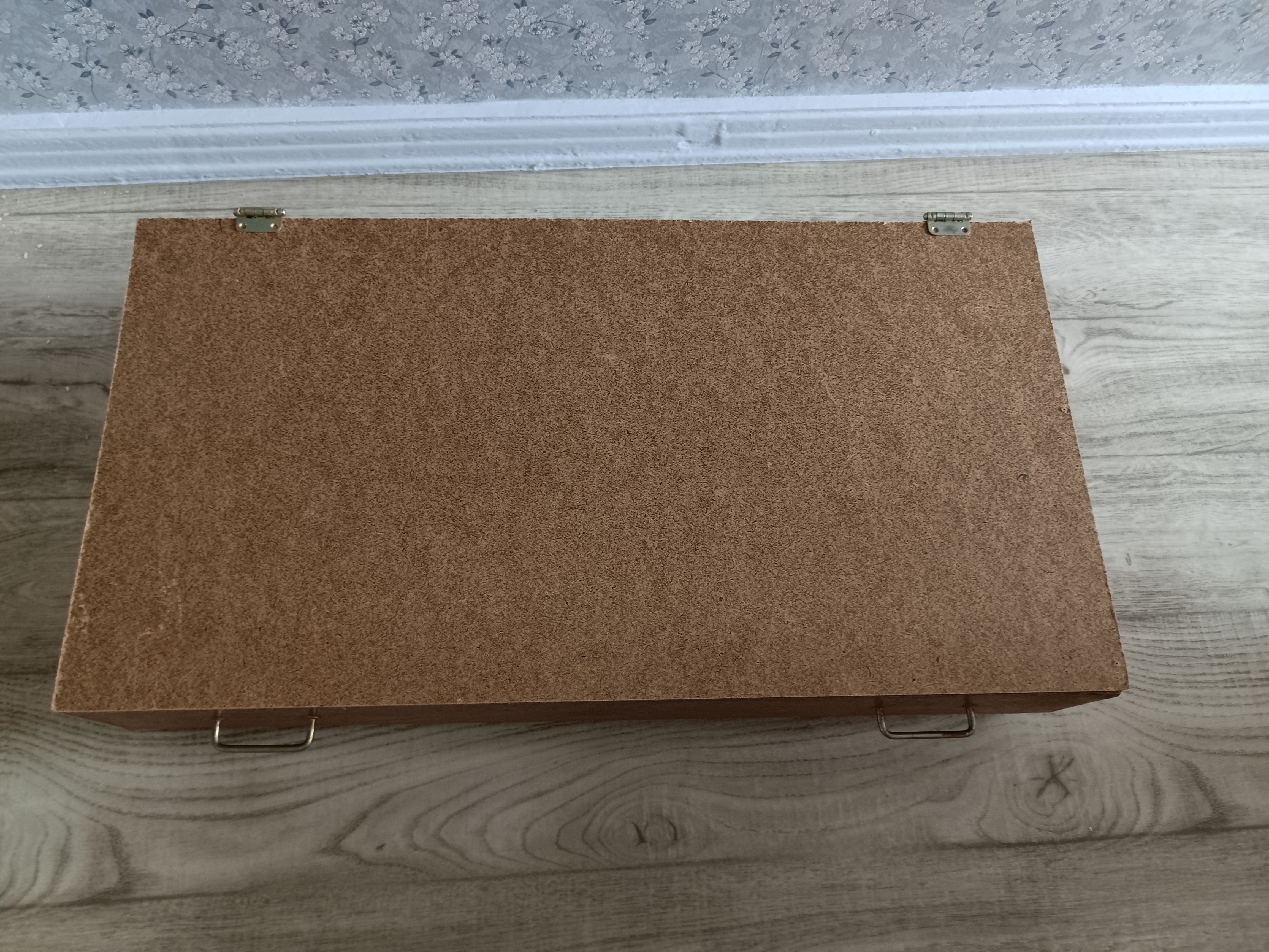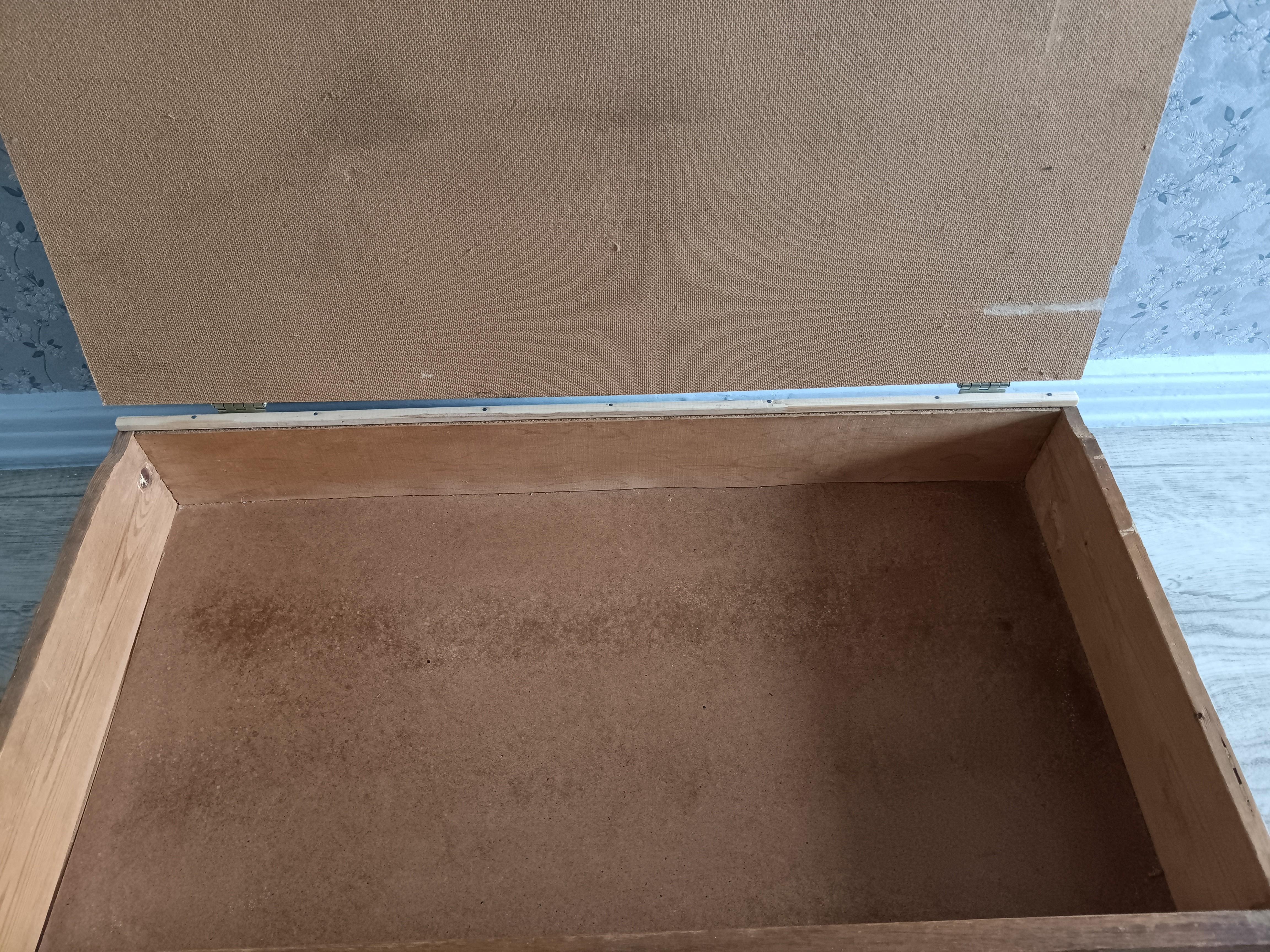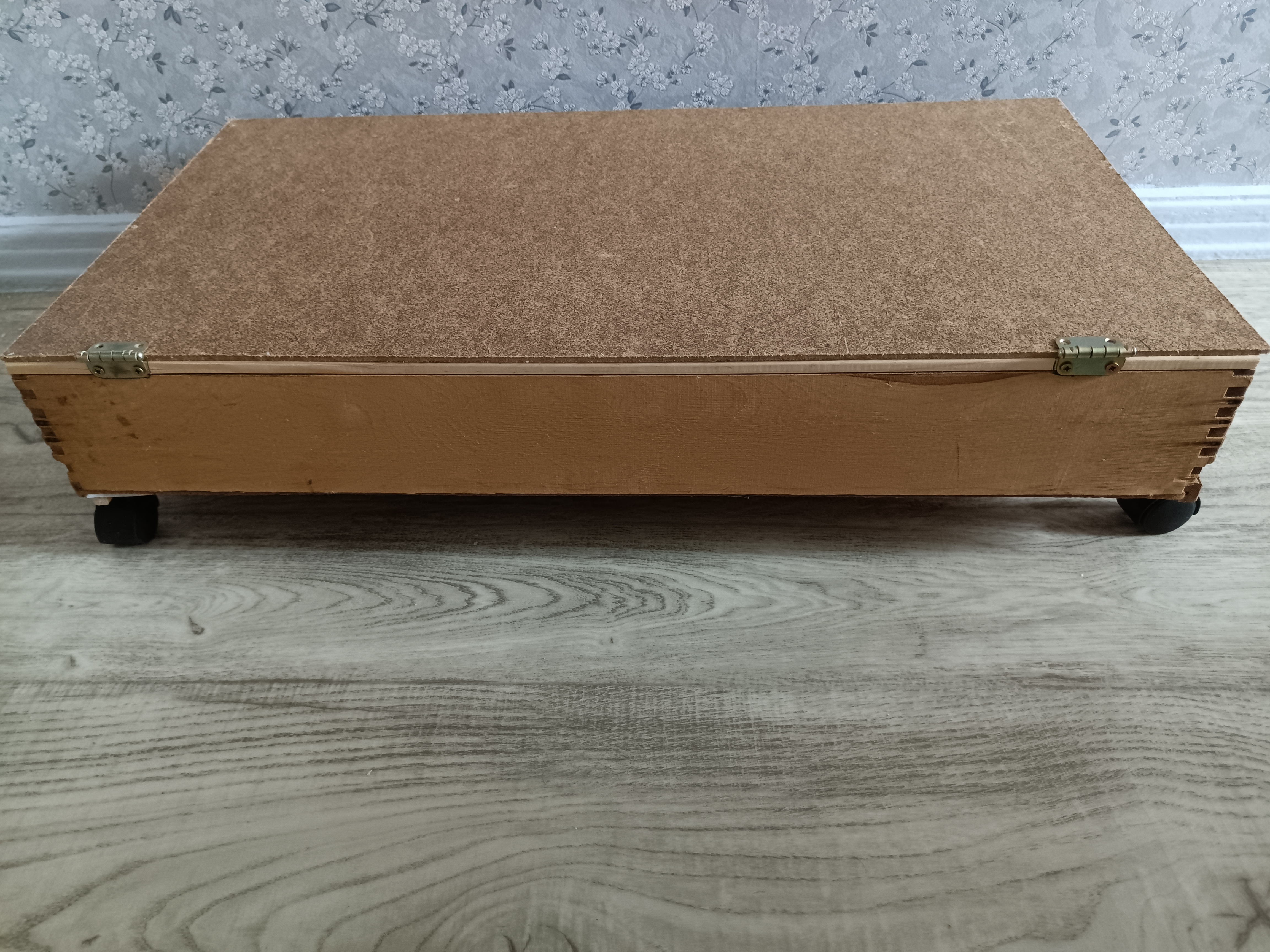 Ящик, теперь с крышкой. Я, конечно, наколхозила тут, но это было с самого начала такое: ящик от доисторической секции с присобаченными к нему колёсиками. И сверху слишком большой лист ДВП. Вот, теперь ДВП обрезано в размер - это так просто оказалось, какого черта я столько мучилась! - и прикреплено петлями, что оказалось несколько сложнее, т.к. ящик сзади был ниже, чем спереди, дизайн такой. Поэтому купила в строительном магазине квадратную в сечении палку подходящего размера и прибила ее гвоздиками. Петли на крышке с одной стороны шурупчиками, с другой тупо клеем. Самое сложное было понять, как ставить петли, изнутри или снаружи. Так и не поняла по какому принципу это работает.