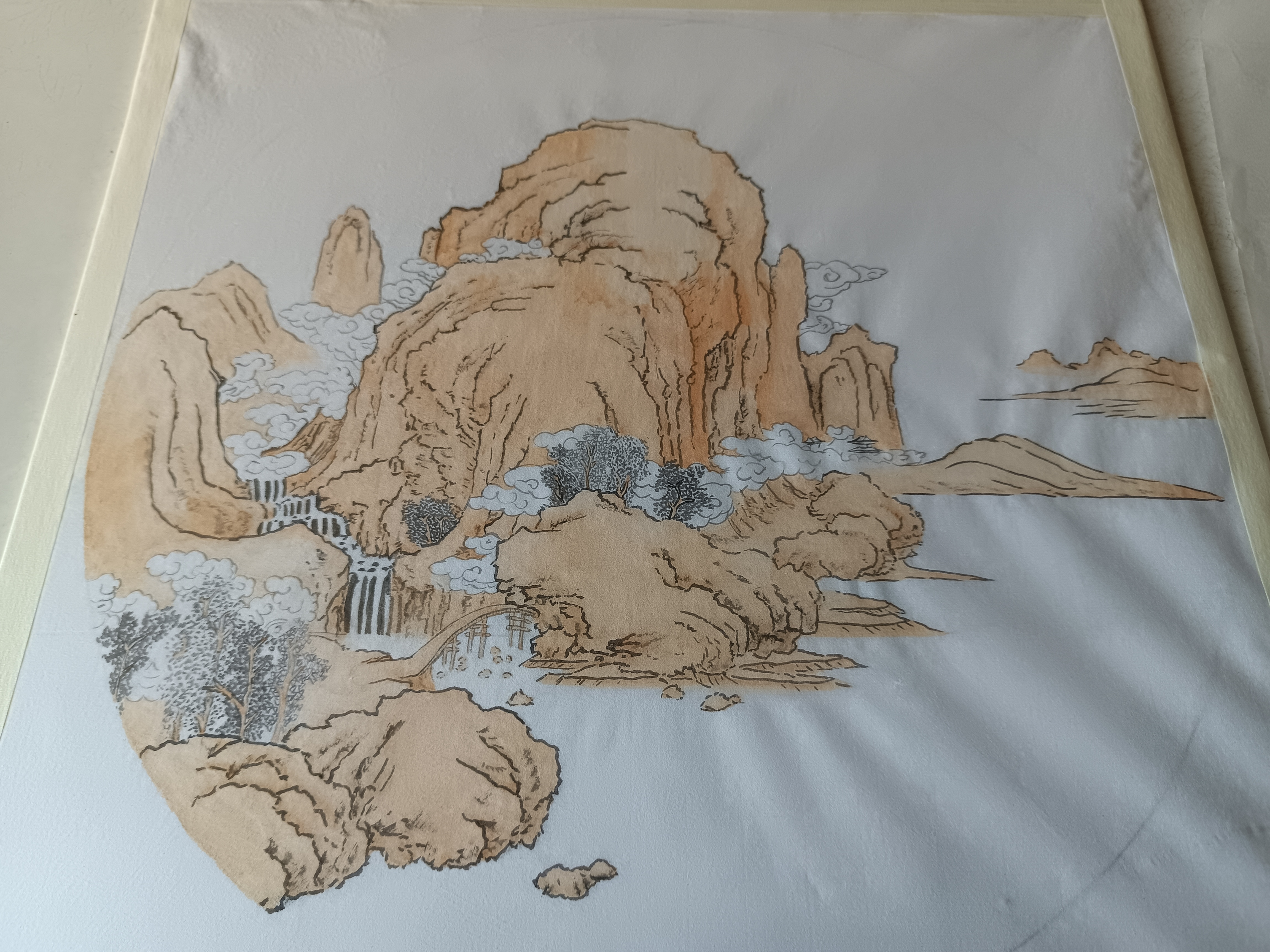 Что-то я перерыжила, кажется. И плохо размешала сначала, отчего вверху лишние разводы. Будем надеяться, это перекроется следующим слоем, он будет непрозрачный. Тяжело. Если кисть полусухая, то краска ложится лучше, но на больших площадях она рискует высохнуть раньше, чем я ее размою или продолжу. А если взять больше краски, то она ложится неравномерно. И с одной стороны картина и так не маленькая, с другой в мелких деталях очень хочется взять лупу, чтоб не ляпнуть краску куда-нибудь не туда, на облако, к примеру. В очках для близи работать немного проще, хорошо, что я летом новые заказала.